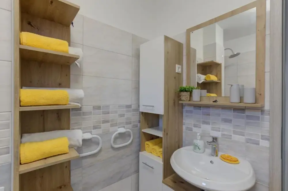 Tuš je odprt (nima enih vrat), izgleda kul, vendar ni zelo priročen za uporabo, veliko vode brizga po kopalnici.